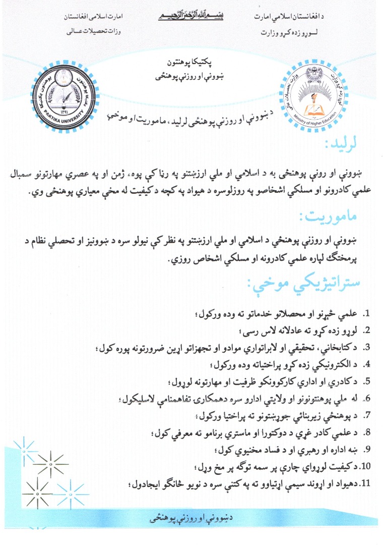 د پکتیکا پوهنتون هڅه کوي تر څو داسي یو اکاډمیک چاپیریال رامنځ ته کړي چې په هغه کې خپلو شرکاوو ته په ملي او منطقوي کچه سیال او باکیفیته تدریس، تحقیق او خدمات وړاندي کړي.